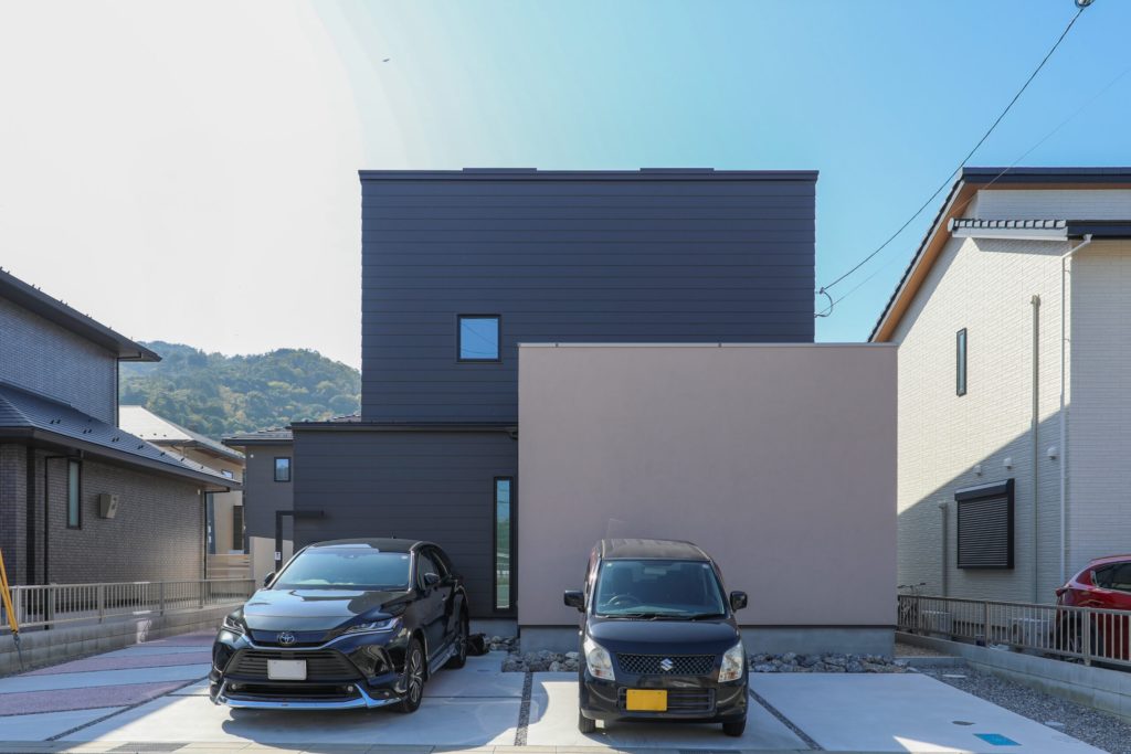 窓の少ないシンプルな形状にブラウンのガルバリウム鋼板と温かみのあるグレージュの塗り壁仕上げの組み合わせがやさしい印象の外観です。