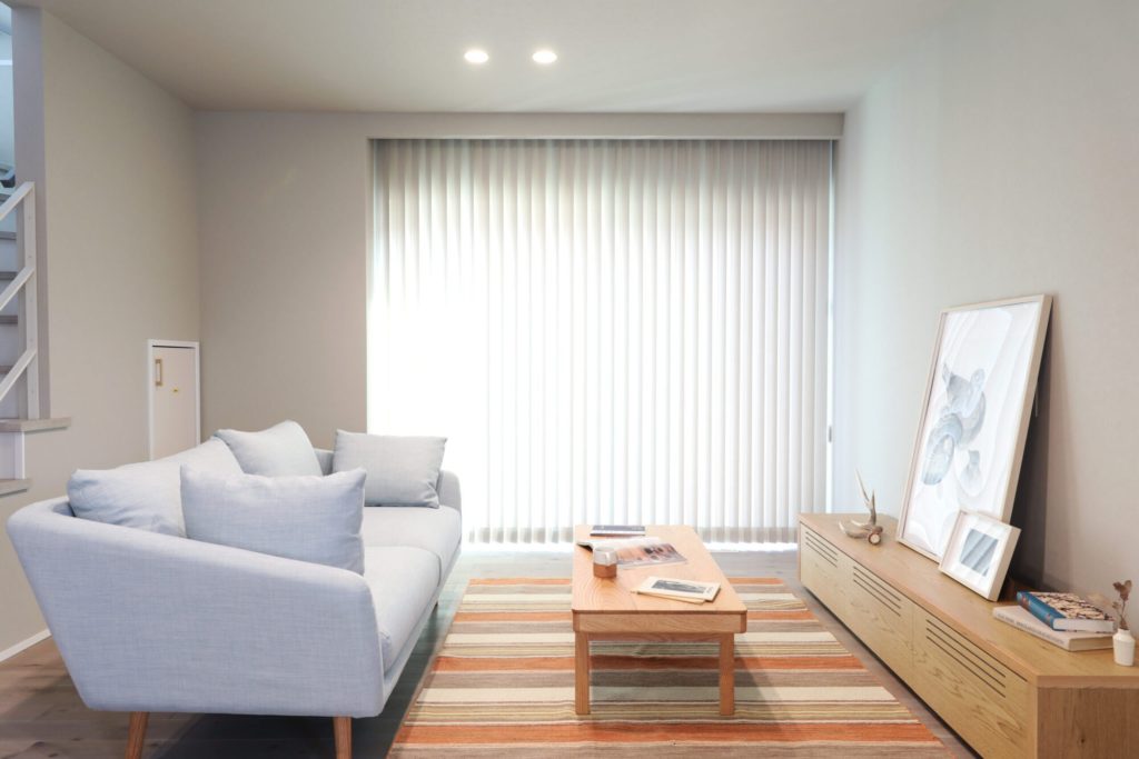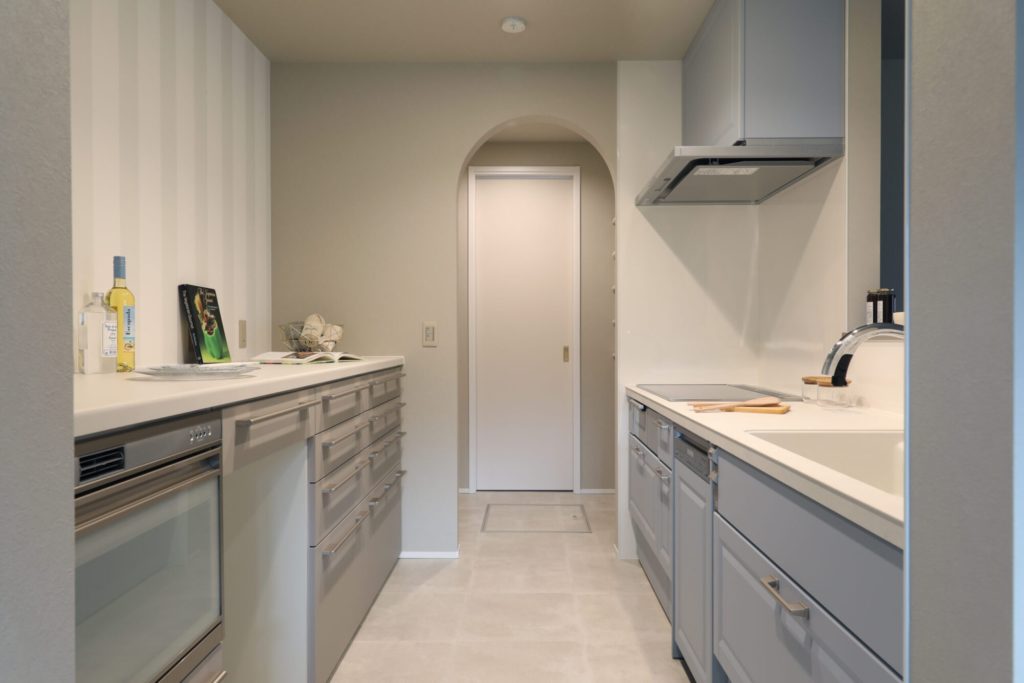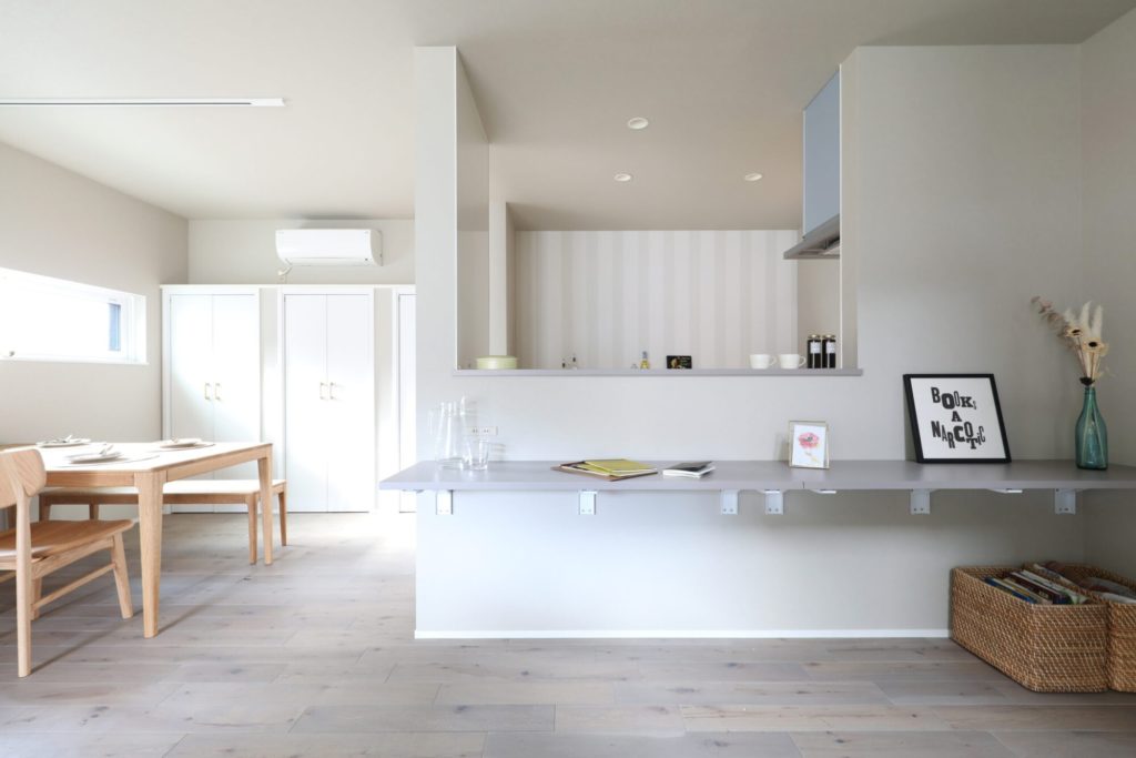 無垢フローリングや造作材のグレーを基本に、ベージュやオフホワイトの組み合わせでシックな中にも可愛さが感じられる内観のお宅です。